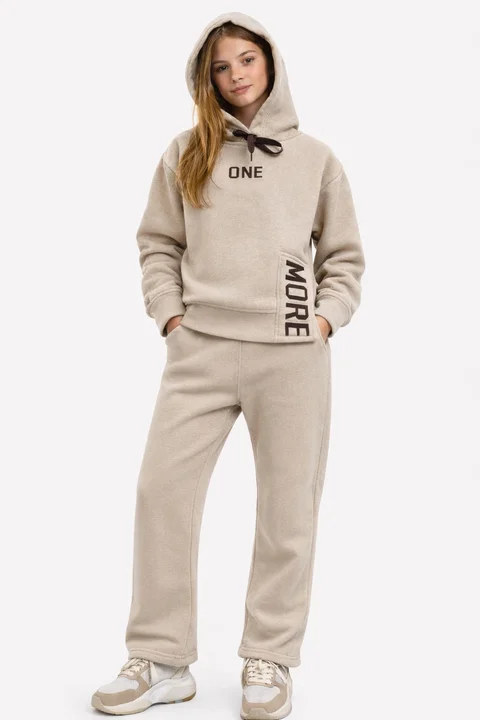 Buzo de teen confeccionado en friza suave, con diseño moderno y detalle de estampa “ONE MORE” que aporta un estilo actual y canchero.