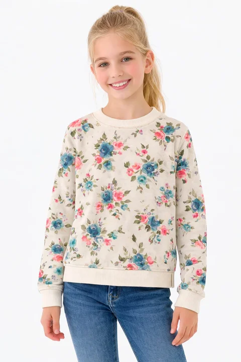 Buzo de niña confeccionado en algodón rústico, con diseño de estampado floral que aporta un estilo delicado, moderno y muy buscado para la temporada otoño invierno.