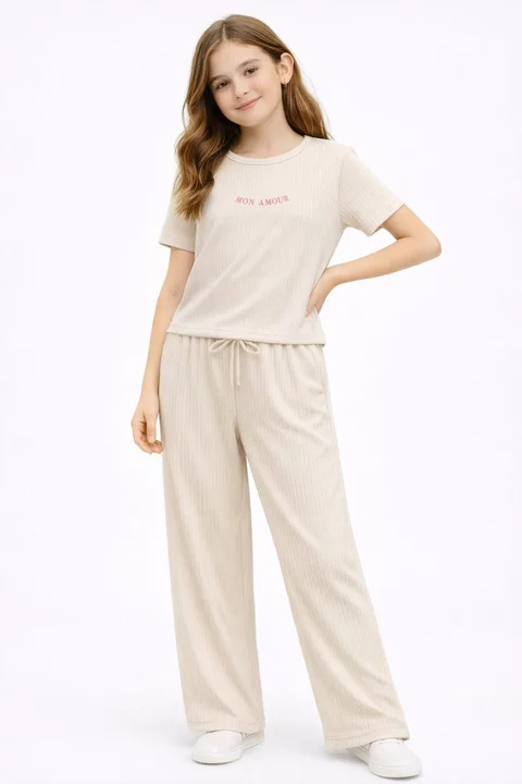 Conjunto de teen confeccionado en morley tipo gamuzado y abrigado, compuesto por remera manga corta con bordado y pantalón cómodo con cintura elastizada y cordon. Un conjunto moderno y versátil ideal para la temporada otoño invierno.