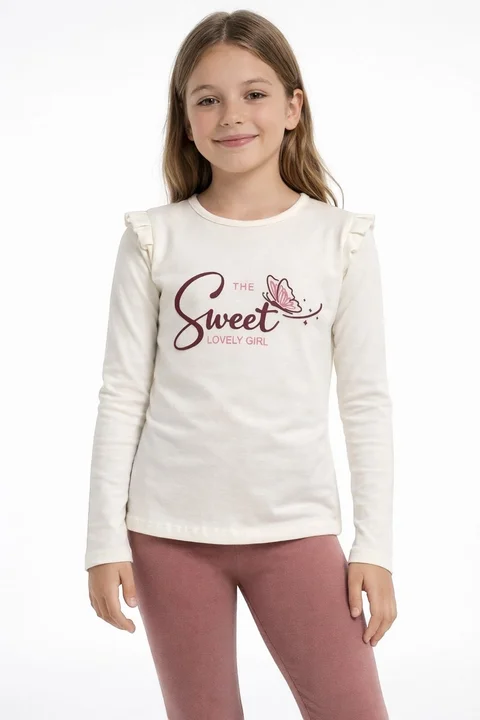 Remera de nena manga larga con volados en hombros y estampa “sweet” en relieve