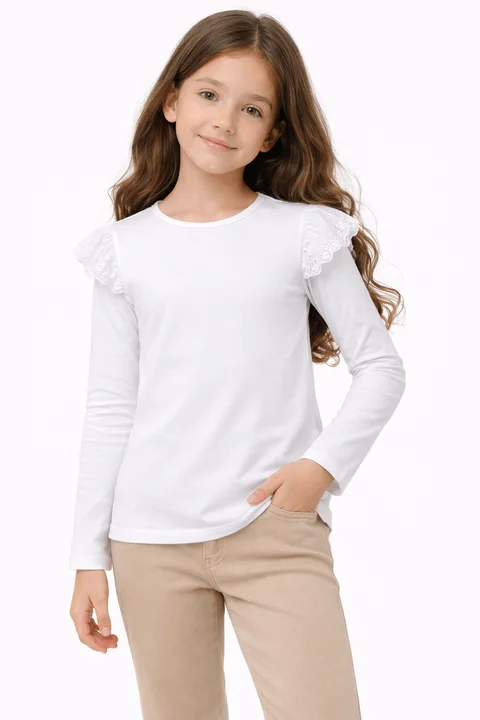 Remera manga larga de nena lisa con brodery calado ancho al tono en el hombro